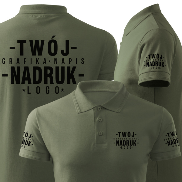 - Męska koszulka polo w kolorze khaki z indywidualnym nadrukiem umieszczonym na piersi, plecach i obu rękawkach. Doskonale sprawdzi się jak i jako element odzieży firmowej, reklamowej lub jako personalizowany prezent dla bliskiej osoby.