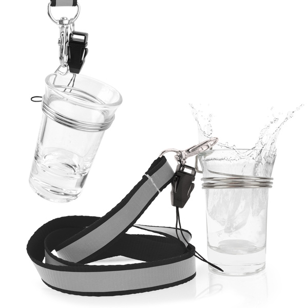 W jego skład wchodzi szklany kieliszek 40ml z obejmą, oraz odblaskowa smycz z karabińczykiem i sznureczkiem do identyfikatora lub kluczyków.