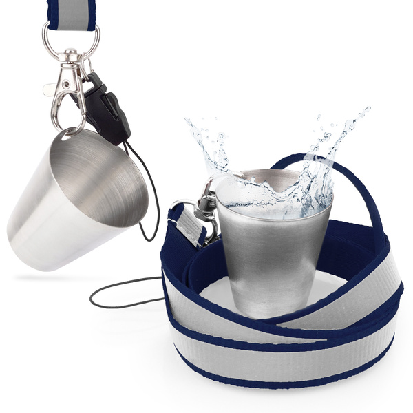 W jego skład wchodzi metalowy kieliszek 20ml oraz odblaskowa smycz z karabińczykiem i sznureczkiem do identyfikatora lub kluczyków.